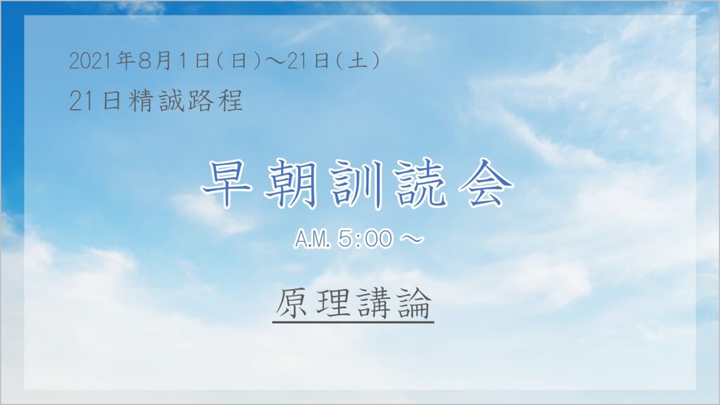 米国での21日精誠を受け継ぐものとして、今月8月1日より21日間、原理の訓読会(早朝5~6時、櫻井会長が解説)が行われます。原理でない考え方が統一運動を分裂させ、無神論に基づく誤った国の文化が歴史的な悲劇を生み出したように、「私たちの考え方が私たちの現実を作る」のです。祝福家庭共同体の信仰を正すため、社会に統一運動の伝統を正しく示すために、原理の学びを進めていきましょう。詳細を見る