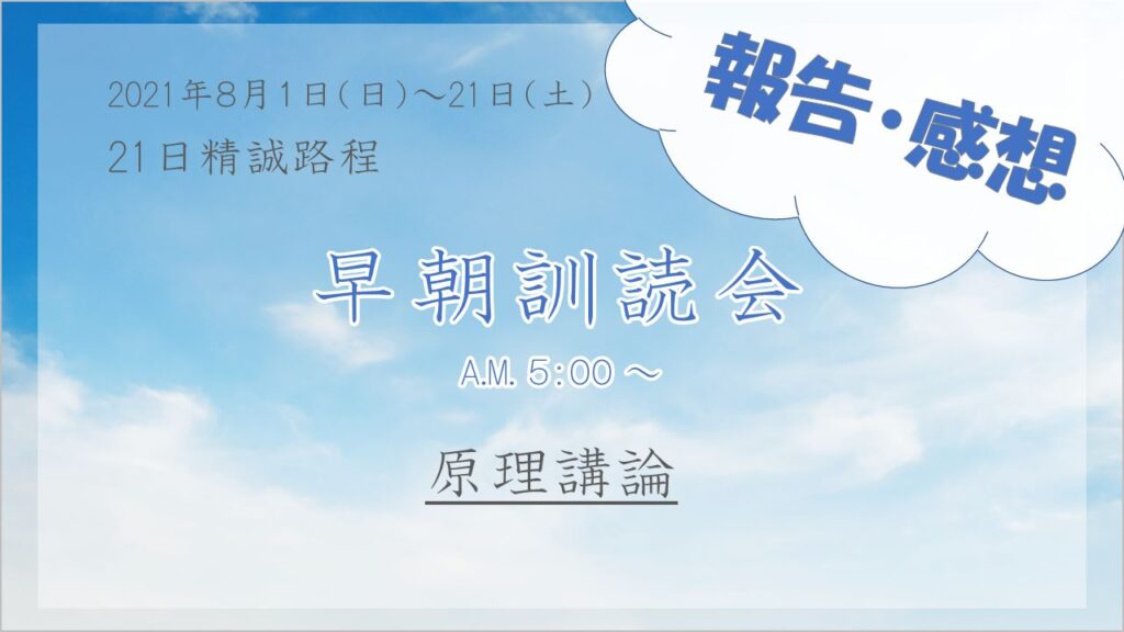 先月8月1日より21日間、米国での21日精誠を受け継ぐ取り組みとして、早朝5時より毎朝1時間、原理講論の訓読会が行われました。毎日100アカウント以上が参加した今回の訓読会の特徴は、何よりも、櫻井会長が直接、顯進様の原理観とガイダンスを詳細に解説した点にあったと言えます。参加者からは「全ての回答が原理にあったことに気付かされた」「統一運動の分裂の理由が原理的に整理された」「今回の解説を通して今を生きる私たちがもつべき姿勢について学べた」等の感想が寄せられています。詳細はこちら