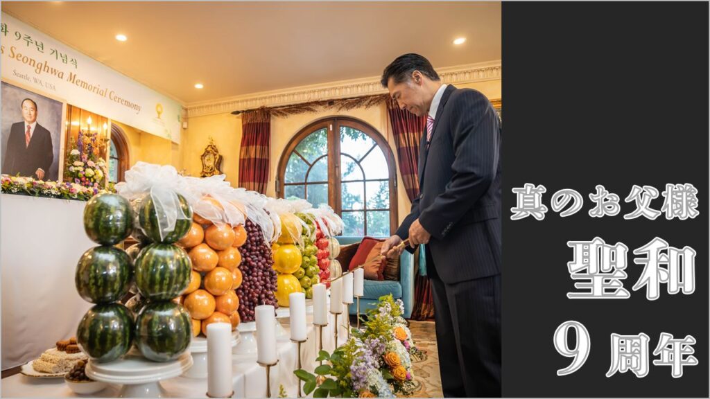 去る8月24日、「真のお父様 聖和9周年」を迎え、米国シアトルにおいては、顯進様家庭を中心とした敬礼式・記念式の場がもたれました。日本では、会長がファミリーWS中であったこともあり、各家庭で精誠を込めて実施。共に御言(聖和8周年記念式での顯進様の祈祷、並びに平和メッセージ13)を訓読しながら、お父様が生涯にわたって頂き続けた夢が、顯進様の歩みを通して生き続けていることを実感するひと時となりました。月例集会での報告を見る