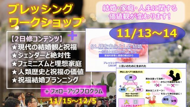 去る11月13日~14日、第20回目となるブレッシングワークショップが開催され、11家庭がここに参加しました(主に親子参加)。1日目は理論編、2日目は実践編として講義を進行。途中、グループ懇談を交えながら、祝福の意義から具体的準備までを学ぶ、総合的な学びの場となりました。