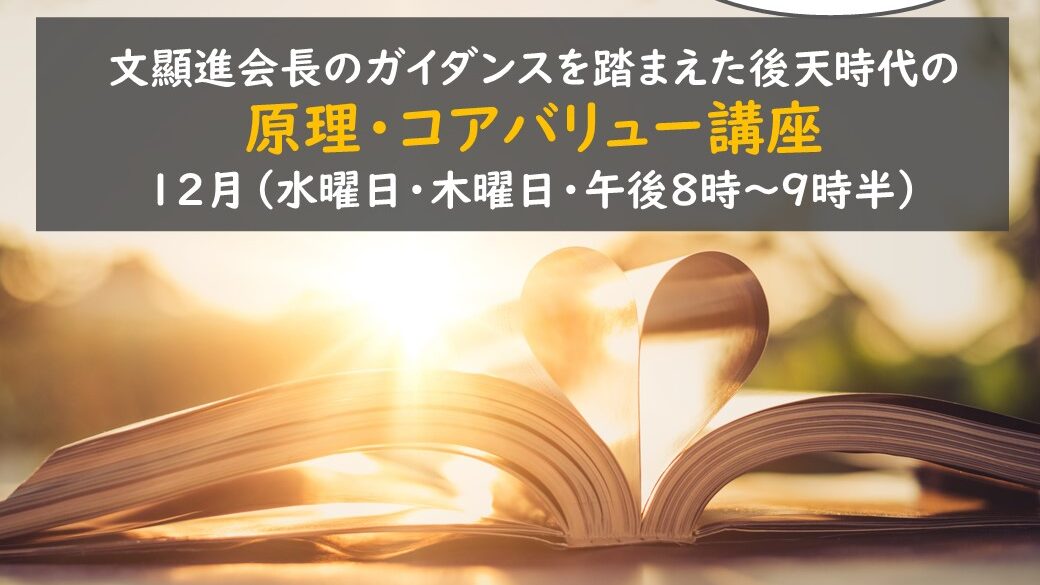 この度、12月1日より週2回(水曜日・土曜日)、計7回にわたって、「原理・コアバリュー講座」が開催される運びとなりました。私たちの運動の出発点は御言にあり、顯進様が今年、リーダーの家庭を集めて指導された内容も、原理に立ち返ることでした。