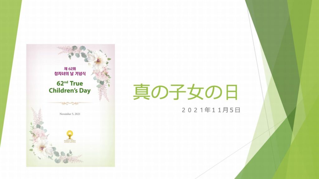 去る11月12日、14日、16日と、三回にわたり、「第62回真の子女の日」(米国式典)の御言報告会が、在米日本人食口を対象として開催され、日本からもZoomを通して共に参加しました。真の子女の日とは、アベルの子女とカインの子女とが摂理的使命を果たせるよう、父母と共に祝う日であるといいます。