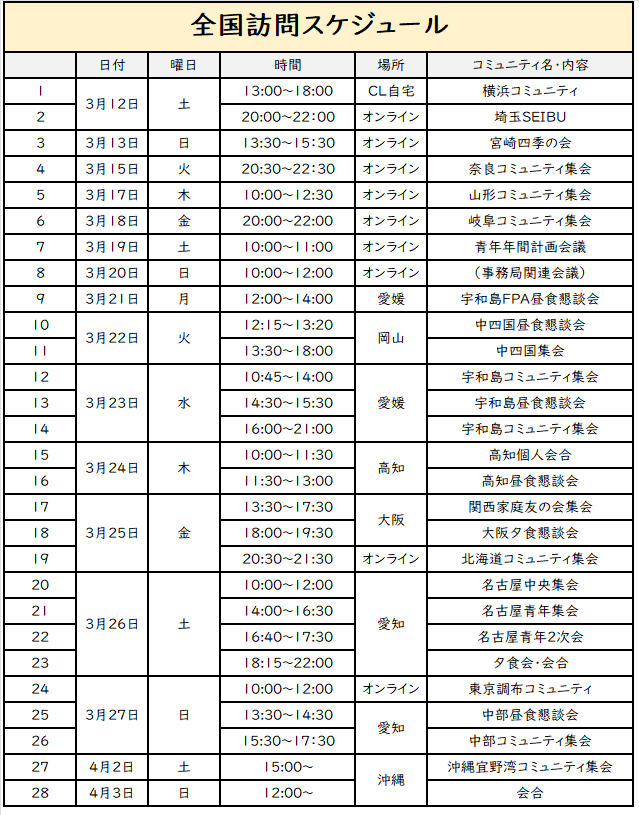 3月上旬から4月初旬にかけ、櫻井会長が全国各地を直接、またはオンラインで訪問しながら、各コミュニティメンバーと直接交わり、対話する時間を持ちました。今回の巡回の目的は、2022年の目標・計画を設定するのに先立ち、全国の兄弟姉妹の様々な心情・事情を伺い、意見交換を行うことにありました。