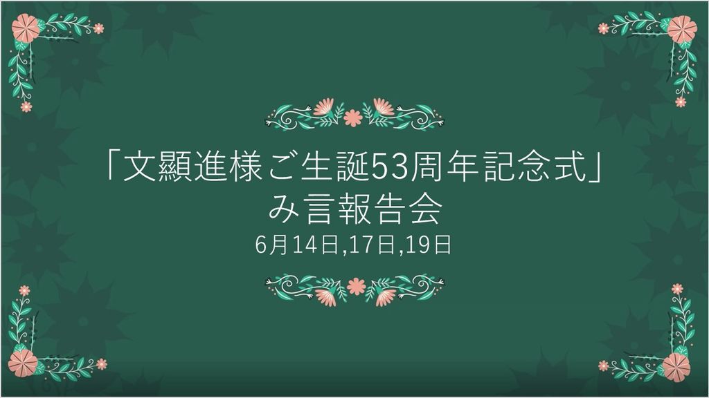③ 「文顯進様御聖誕53周年記念式」み言報告会(6/14,17,19)