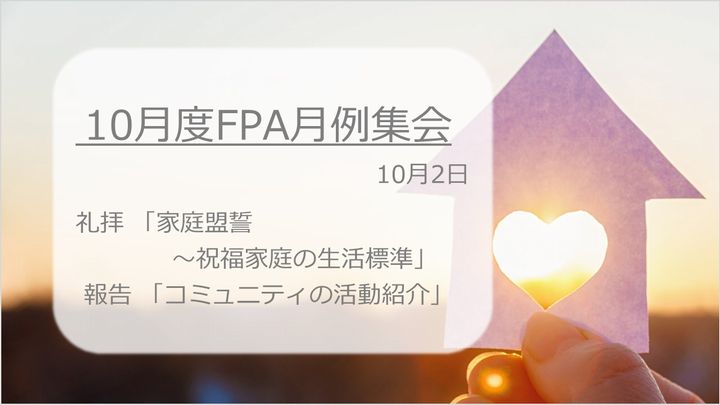 10月2日、FPA月例集会では、前々回の流れに続き、櫻井正実会長より「家庭盟誓―祝福家庭の生活指針」としてメッセージをいただきました。