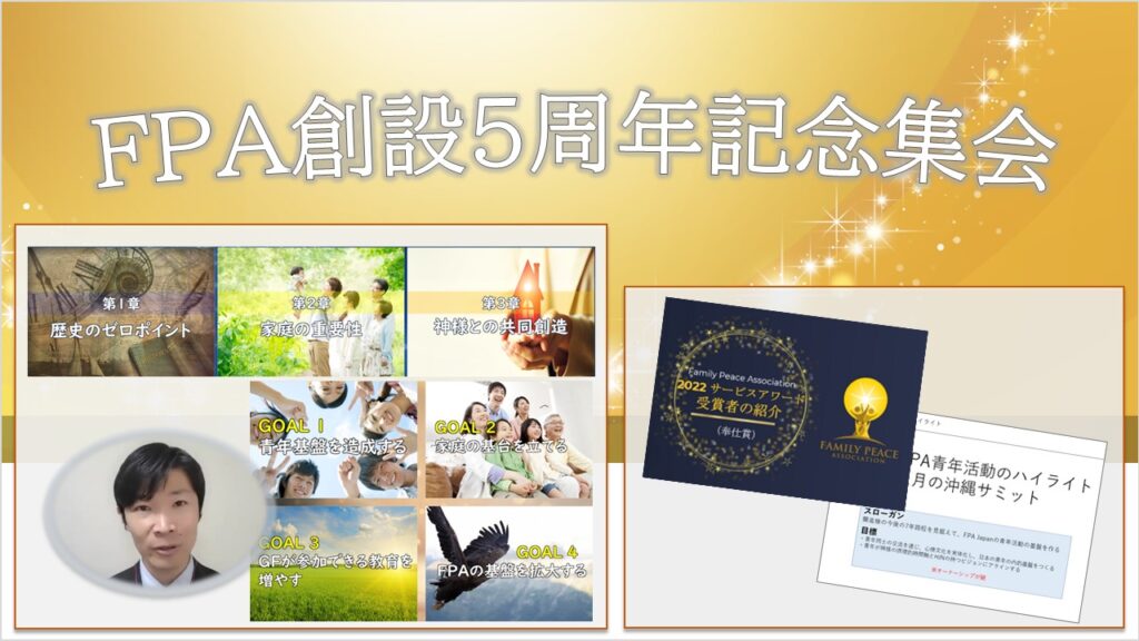 続く第2部では、例年同様、「FPAピースアワード」として、全体のために貢献してくださった方々への表彰式を行うと共に、代表者より力強い証をいただき、改めて会員一人一人のオーナーシップによって支えられているFPAであることを実感する場となりました。 参加者からは、「FPAの歴史的価値を再認識した」「発表者の熱意が伝わり、胸が熱くなった」「いよいよ顯進様が翼を広げて飛翔されるイメージが浮かび、希望を覚えた」等の感想が寄せられています。