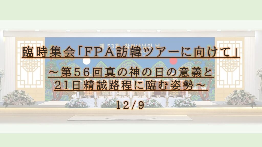 12月9日、「FPA訪韓プログラムに向けた特別集会」として、櫻井会長より、今度の「第56回真の神の日」がもつ摂理的意義と「21日精誠路程」(12/10~12/31)に関する説明会が行われました。