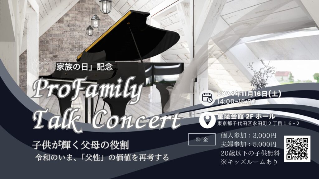 来たる11月16日、家庭や子育てに関する語り(Talk)と音楽による癒し(Concert)とを融合させた学びと文化の広場、「Pro Family Talk Concert」(主催:Pro Family研究所)が開催されます。