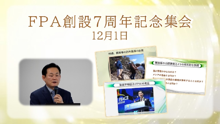 12月1日、今年最後の月例集会を「FPA創設7周年記念集会」として開催。FPAインターナショナルの金慶孝副会長をお迎えし、特別講話をいただく運びとなりました。