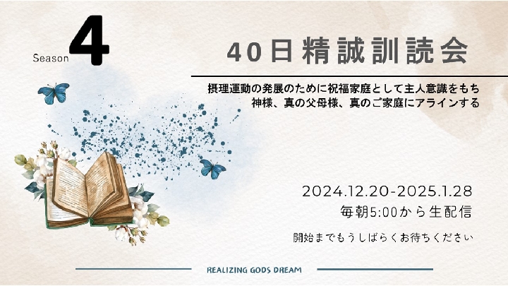 去る12月20日より、来年の「真の神の日」(前日)までの40日間、新年を迎えるための内的精誠として、オンライン早朝訓読会(5:00~)を実施していく運びとなりました。