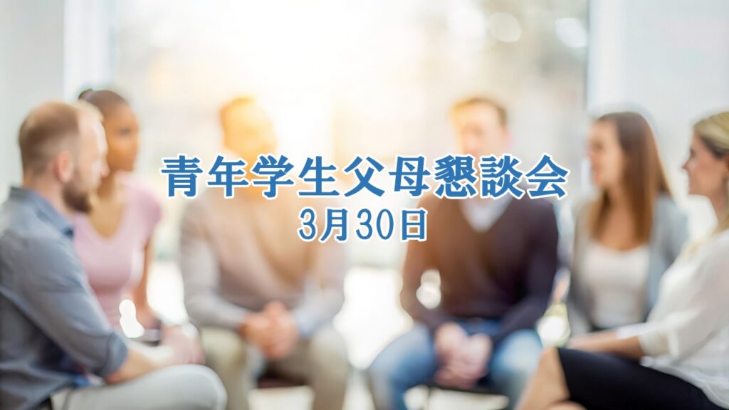 3月30日、16歳(新・高1)〜24歳の子女をもつ父母を対象とした「青年学生父母懇談会」が開催されました。