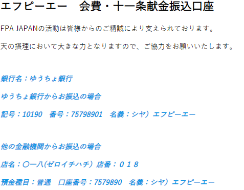 お問い合わせフォームまたは、info@fpajapan.org のメールにお問い合わせいただき、FPAから郵送されてくる自動振替用紙にお引き落とし希望の口座をご記入の上、FPA事務局宛てに郵送をお願いしております。銀行手続きの為、引き落としの開始は到着から2ヶ月ほどかかる場合がございますのでご了承ください。