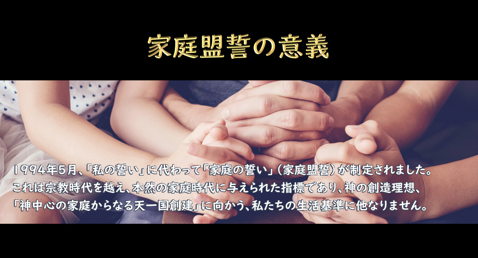 【FPA】家庭盟誓の解説まとめ講座のご案内 2023.03.15 お知らせ これまで櫻井正実会長が礼拝メッセージとして語ってきた「家庭盟誓~祝福家庭の生活標準」のシリーズが8章まで終了いたしましたので、下記ページにてまとめて視聴できるように致しました。 2023.03.14 家庭盟誓の解説 家庭盟誓の意義 1994年5月、「私の誓い」に代わって「家庭の誓い」(家庭盟誓)が制定されました。これは宗教時代を越え、本然... 家庭盟誓は宗教時代を越え、本然の時代に与えられた指標であり、神の創造理想実現のために与えられた絶対的基準です。 天が願い、期待されている内容がなんであるのかを再確認して、自分と家庭、コミュニティに広げて行けるようにしましょう。