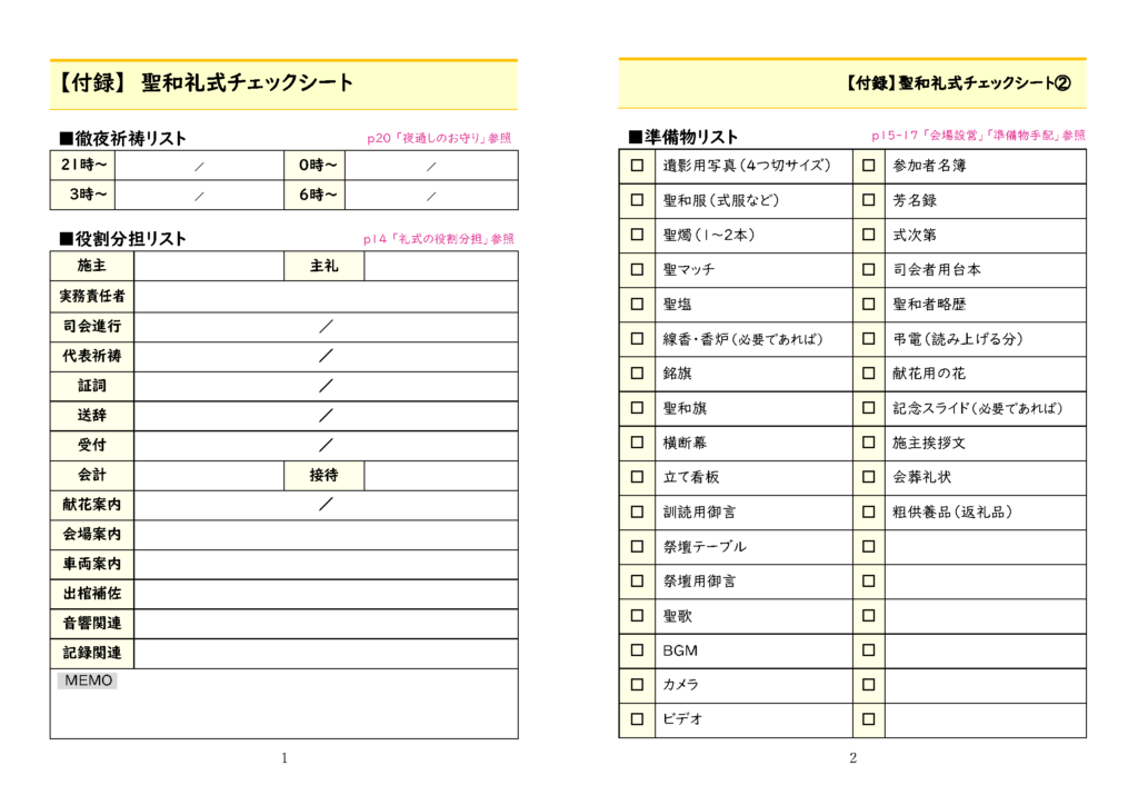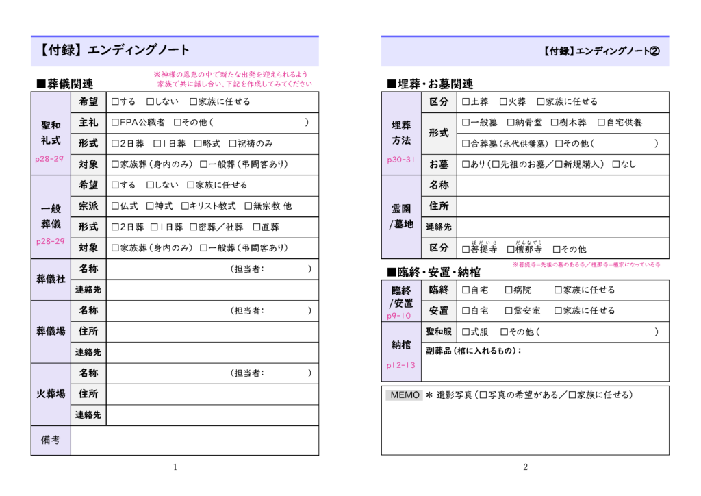 ガイドブックの巻末に添付した付録です。「エンディングノート」は聖和に先立ち、重要事項を整理しておくための資料。「チェックシート」は聖和礼式の準備・運営をサポートするための資料になります。ご活用ください。
