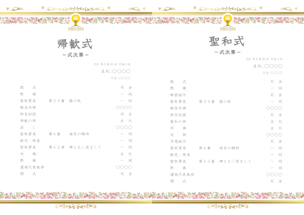 聖和式・帰歓式を行う際の式次第になります。一つにまとまっているタイプ、別々に印刷されるタイプの2種ご用意しました。それぞれの状況に応じてご活用ください。