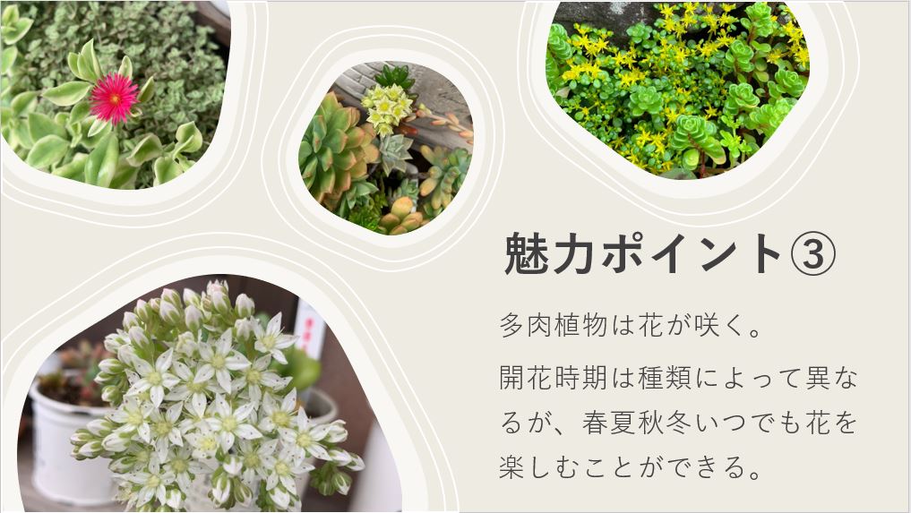 突然のオファーだったので、慌ててパワーポイントでプレゼンテーションを作りました。実際に自分が育てている多肉植物やネットから借りてきた画像で、多肉植物の魅力についてご紹介します(^^♪